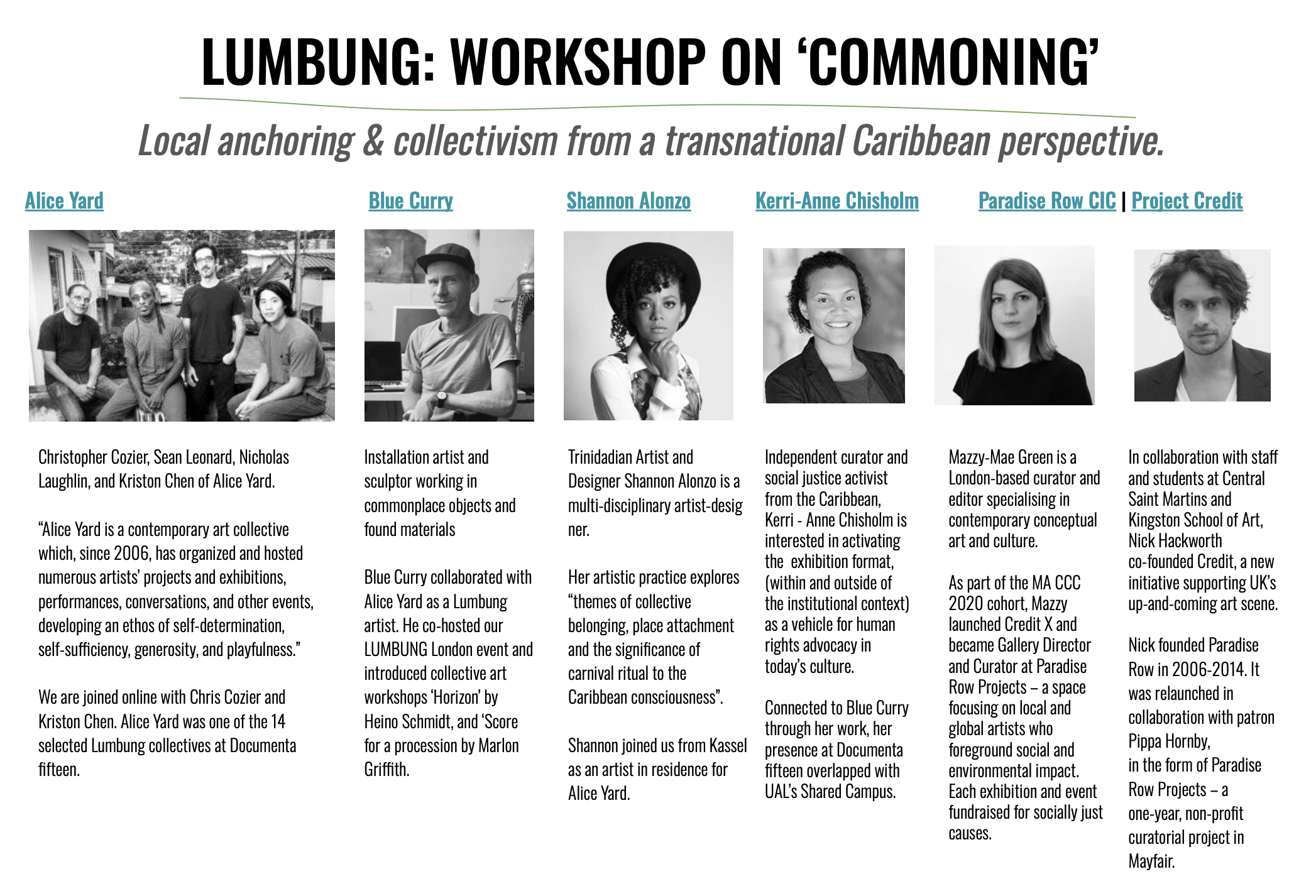 In collaboration with Trinidadian collective Alice Yard, scholar Kerrie-Anne Chisholm, artists Blue Curry and Shannon Alonzo CSM students co-hosted a event at gallery Paradise Row, run by founder Nick Hackworth and curator Mazzy Mae Green. In the D.I.Y spirit of lumbung, the activation included hybrid panel discussion, collective artmaking with found materials, sharing food, and curated images projected in the space.